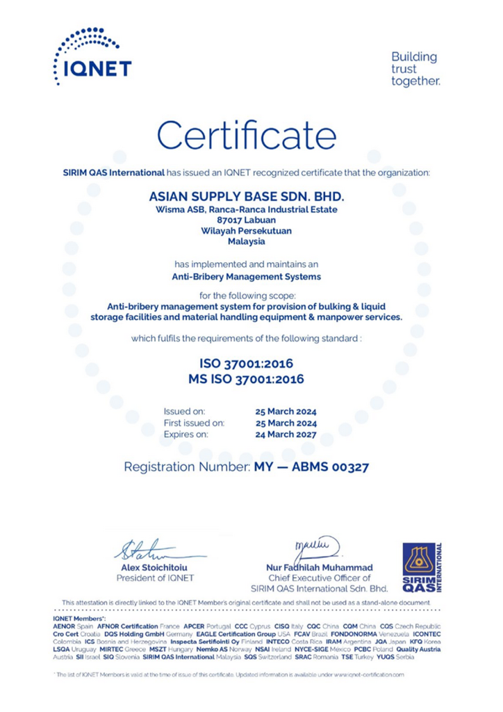 “Anti-bribery management system for the provision of bulking and liquid storage facilities, material handling equipment, and manpower services.”