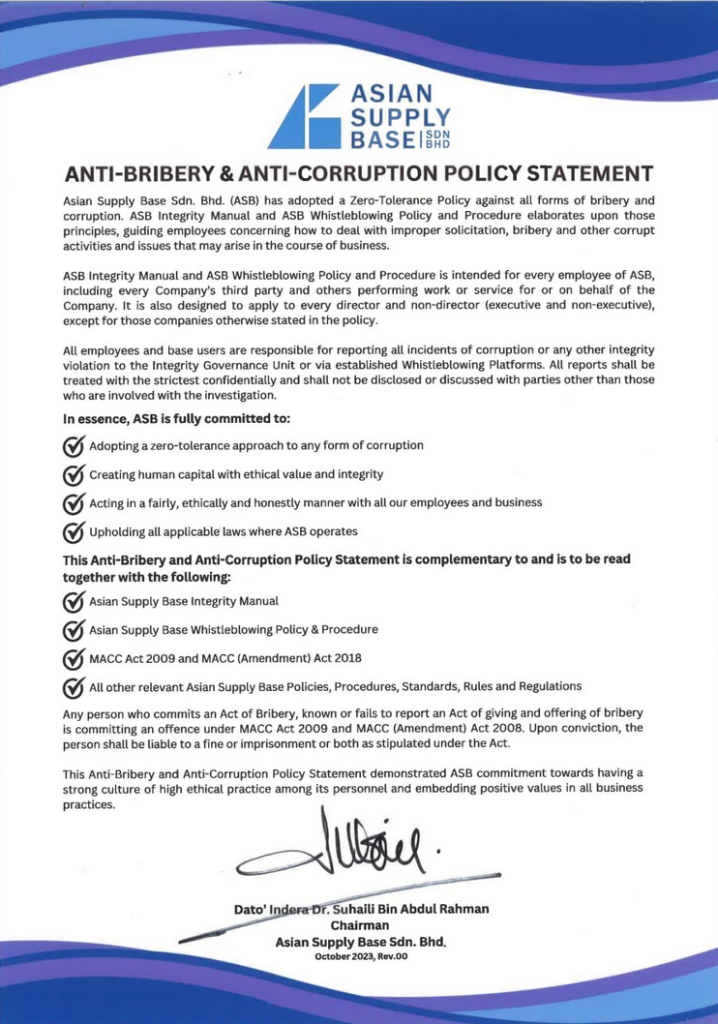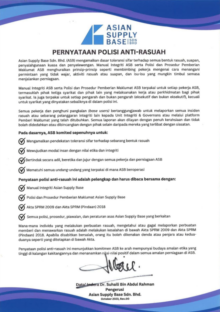 At Asian Supply Base (ASB), we are committed to delivering our services with the highest level of integrity, ensuring that all business activities are conducted through fair, transparent, and accountable processes. While we operate on a large and complex scale, we place equal emphasis on cultivating a culture of ethics and trust within our internal operations.